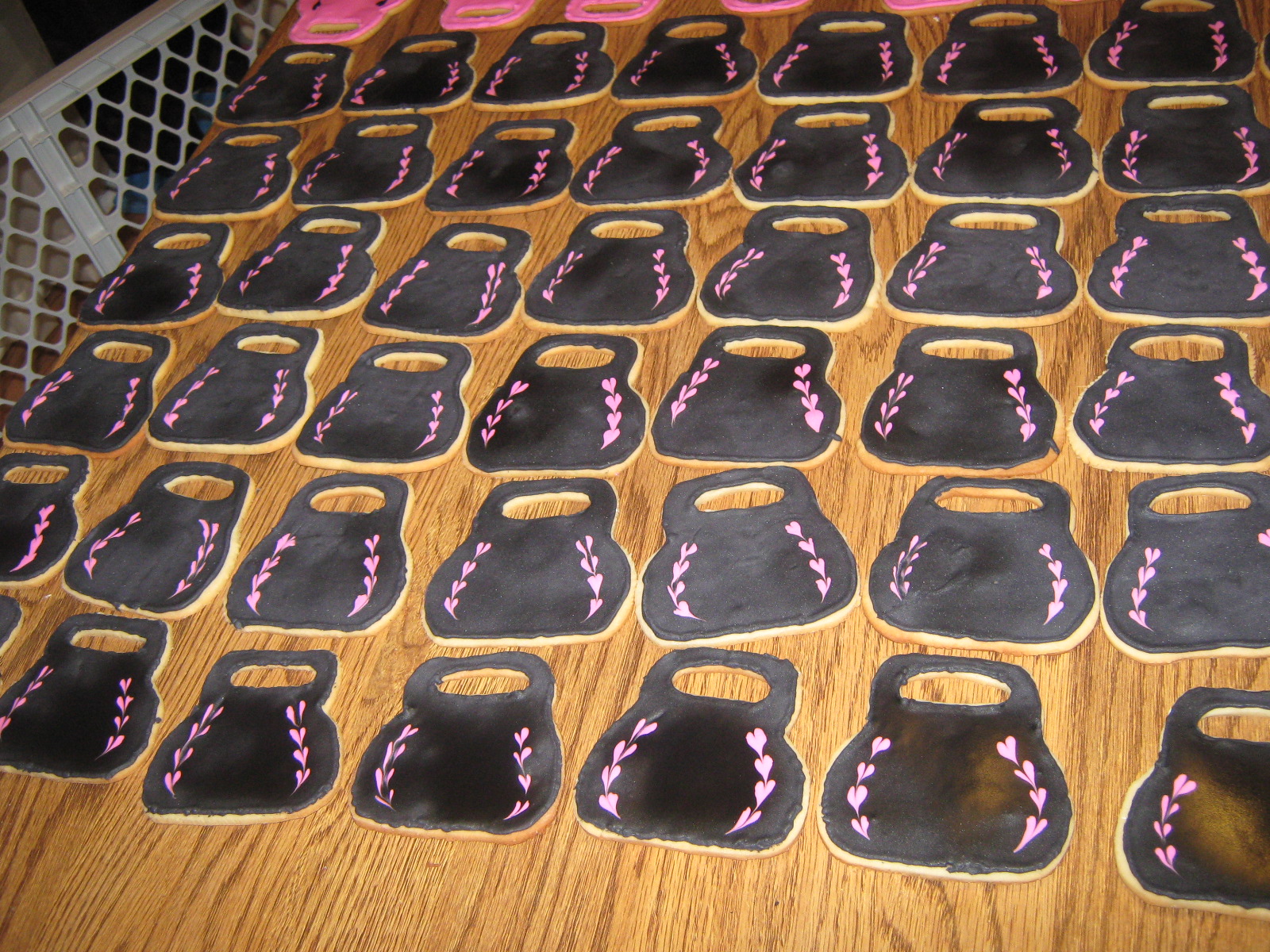This week I have been completely swamped. Monday afternoon as I was making dinner, on the phone with my friend, discussing the tea cakes and petit fours for her cousin's wedding shower/tea party, I got another call from a woman who is a sales rep for 31. She asked if I could make her 8 dozen black and pink, purse shaped cookies by Thursday. I should have turned her down, especially knowing what all I had on my plate (the wedding shower food, Aaron's mom's birthday cake and dinner, and ya know, all the stuff I normally do during the week) but she said she would pay me double, so I couldn't bring myself to turn down the money.